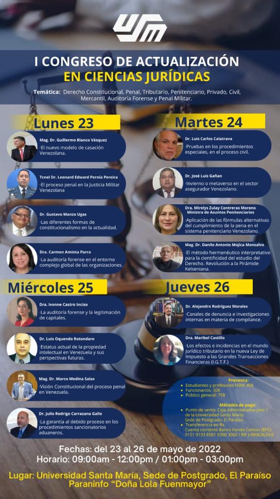 La Decana de Postgrado, Investigación y Extensión de la Universidad Santa María, Nelly Sánchez “invita a los abogados, docentes, investigadores, estudiantes, especialista en las diversas ramas del saber y público en general para participar, en el I Congreso de Actualización de Ciencias Jurídicas, evento para realizarse en el núcleo de la USM, El Paraíso, Paraninfo Doña Lola Fuenmayor”, evento para realizarse entre los días 23 al 26 de mayo de 2022, jornada de trabajo establecida desde las 9am hasta las 3pm.