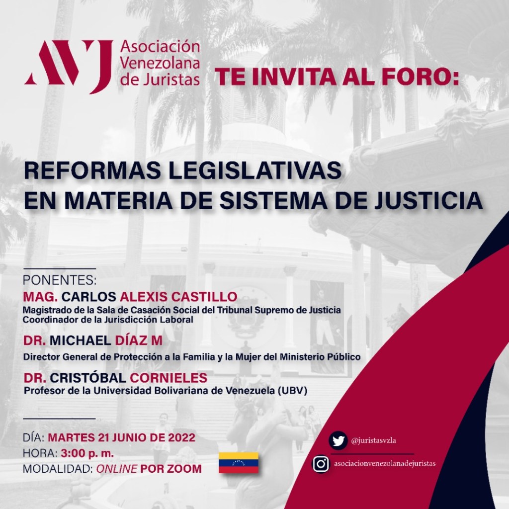 Los miembros de la Junta Directiva de la Asociación Venezolana de Juristas (AVJ), como agrupación que “promueve la defensa de los Derechos Humanos, del sistema democrático y el fortalecimiento del Estado de Derecho, nacional e internacional”, invita al publico en generar, en participar vía web Online, en el próximo foro “Reformas legislativas en materia del sistema de justicia”, en Venezuela.